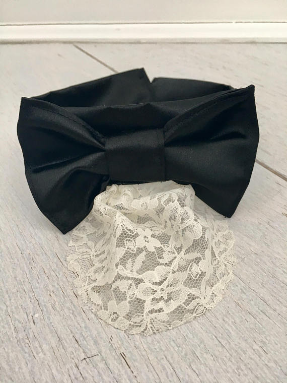 Made of a black shiny satin fabric ( 100% poly ), creme flower lace and Velcro closure around neck.