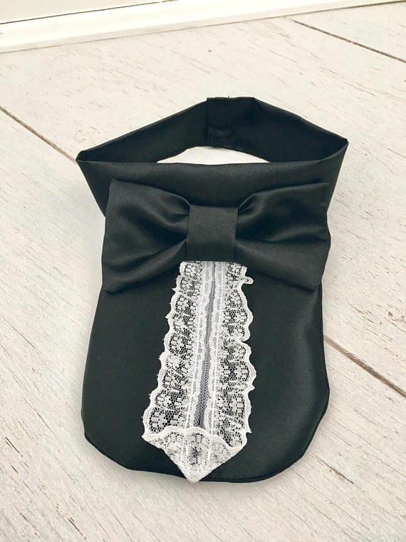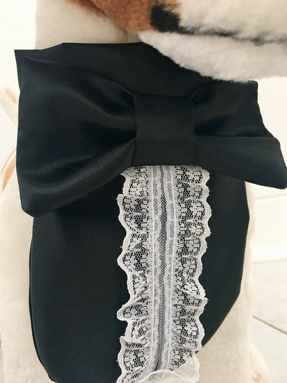 Made of a black shiny satin fabric ( 100% poly ), white lace trim, black fabric 100% polyester and Velcro closure around neck.